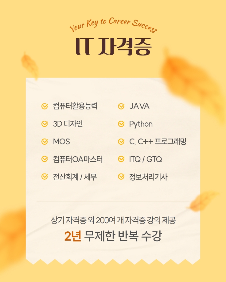 - 총 200여개 IT자격증 및 전공 자격증 강좌 제공