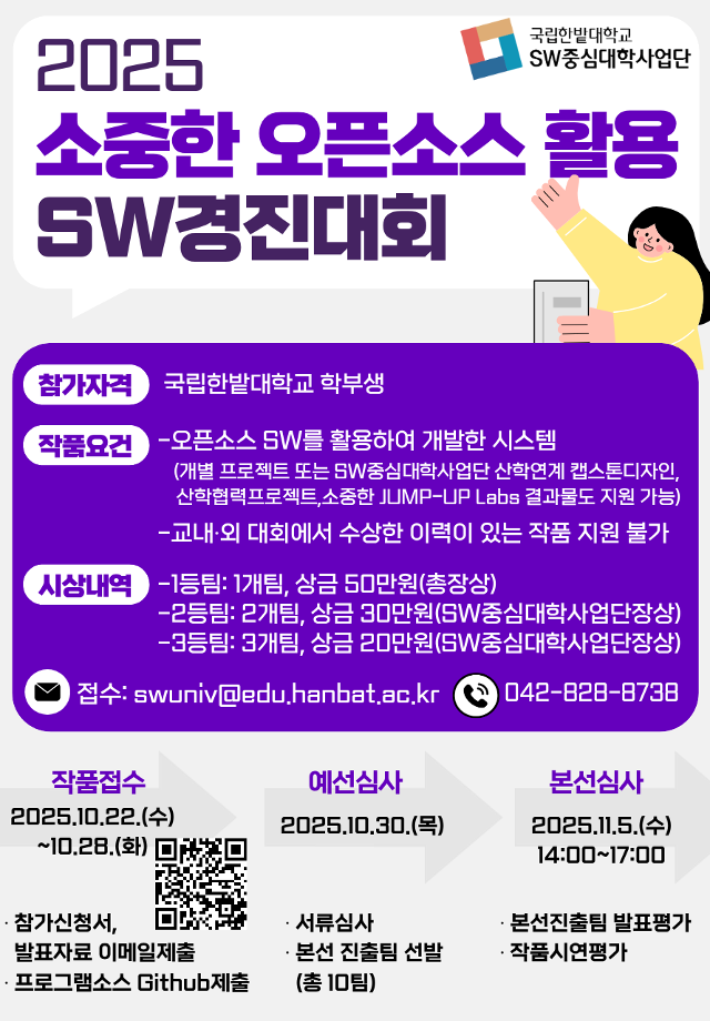 SW중심대학사업단에서 오픈소스 활용 SW인재 발굴을 위하여 ‘2025년 소중한 오픈소스 활용 SW 경진대회’를 다음과 같이 개최하고자 하오니 많은 학생들의 참여 바랍니다.