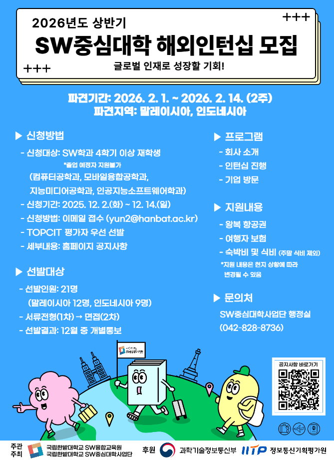 소프트웨어중심대학사업단에서 다음과 같이 ‘2026년도 상반기 SW중심대학 해외인턴십’을 추진하오니 많은 학생들의 참여 바랍니다.
