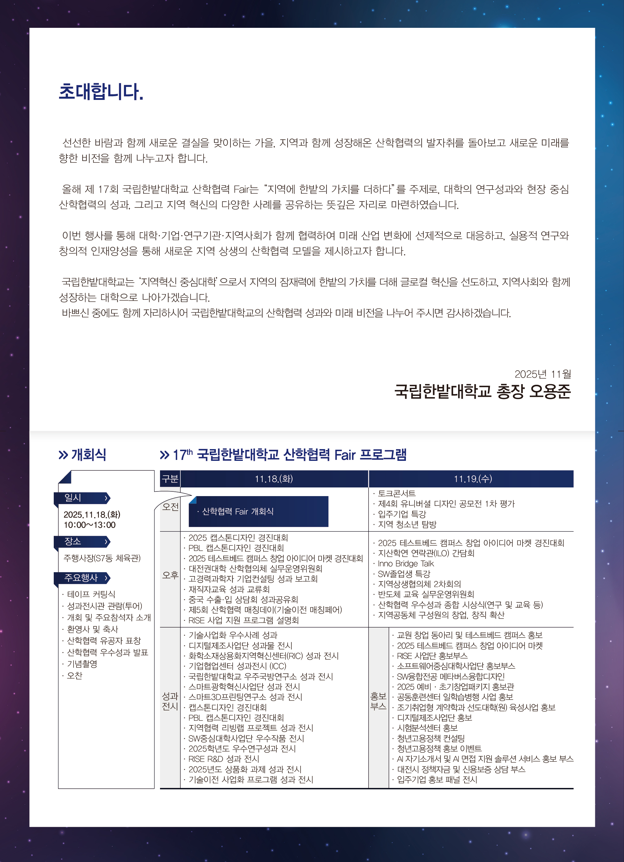 11월 18일(화)~19일(수)까지 본교 S7동에서 '2025 국립한밭대학교 산학협력 Fair'가 개최됩니다.