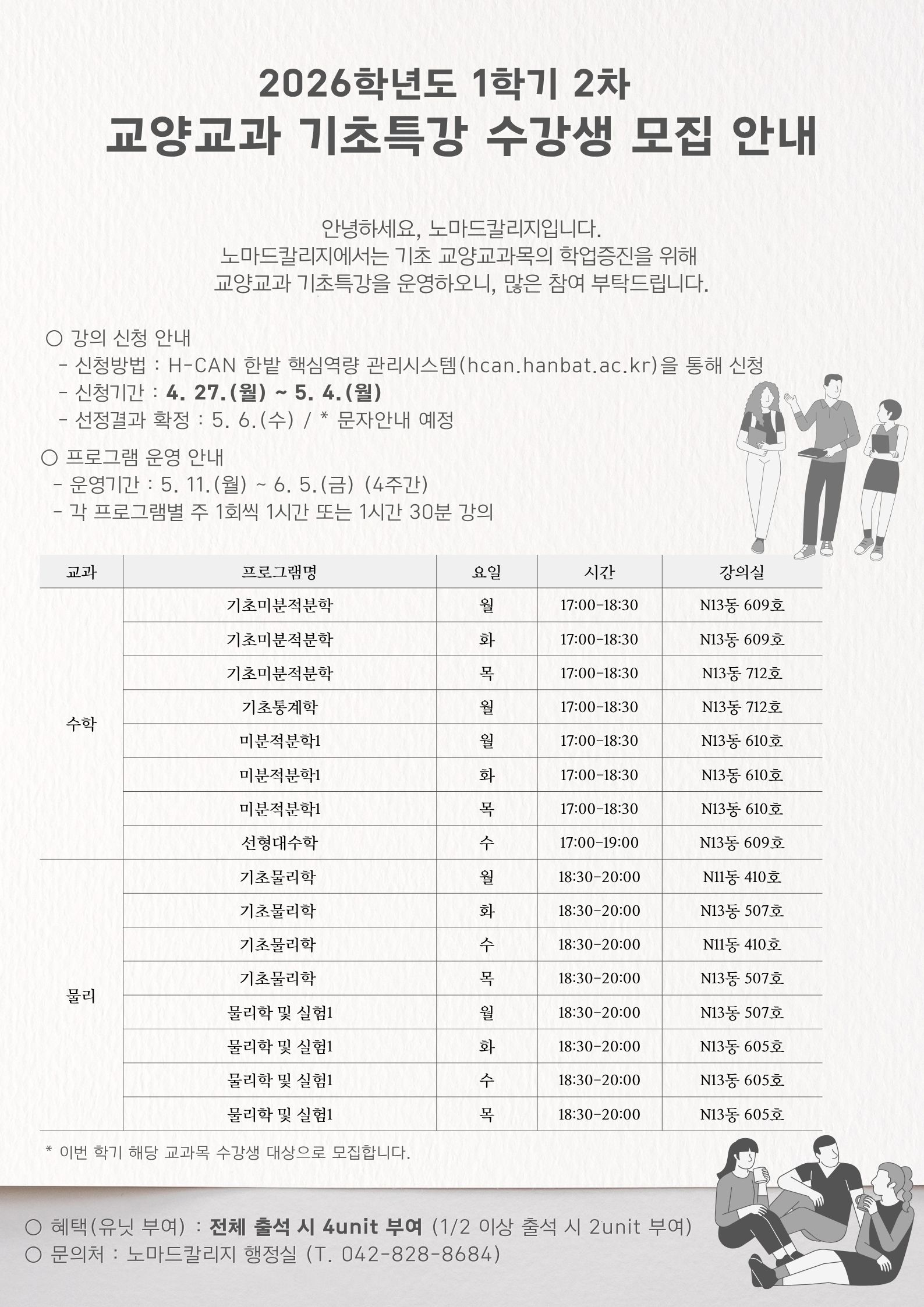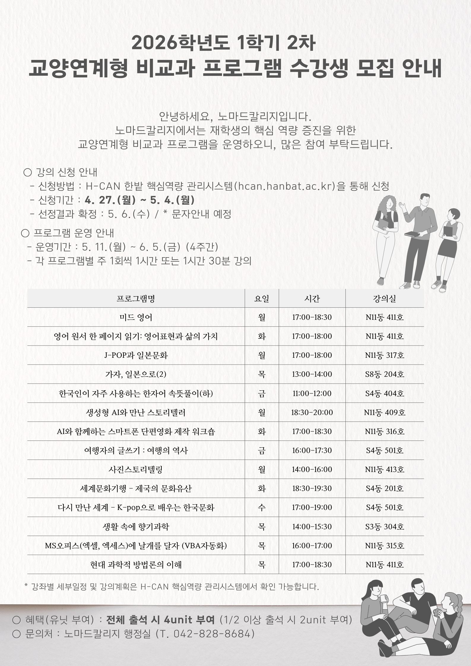 2026학년도 1학기 2차 교양연계형 비교과 프로그램 및 교양교과 기초특강 수강생을 4월 27일(월)부터 모집합니다.