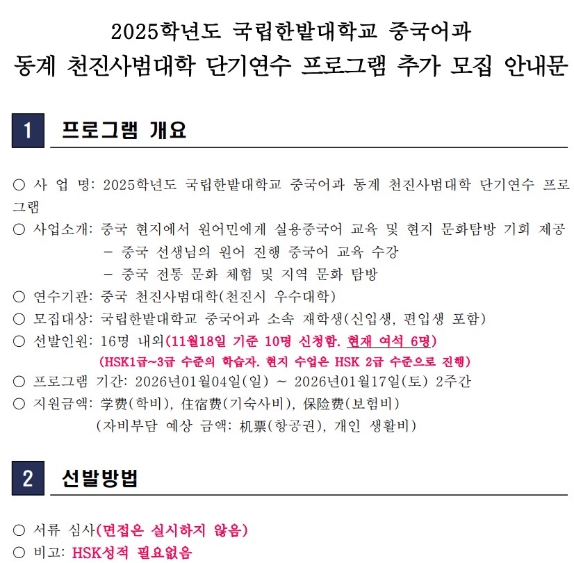 2025학년도 국립한밭대학교 중국어과 동계 천진사범대학 단기연수(2주) 프로그램 추가 모집 안내문